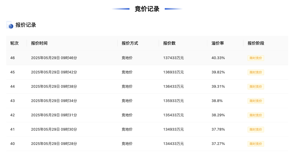竞价记录显示,该地块经过46轮竞价后永華证券,由杭州浙群置业有限公司以总价137433万元竞得,成交楼面价23707元/平方米,溢价率40.33%。